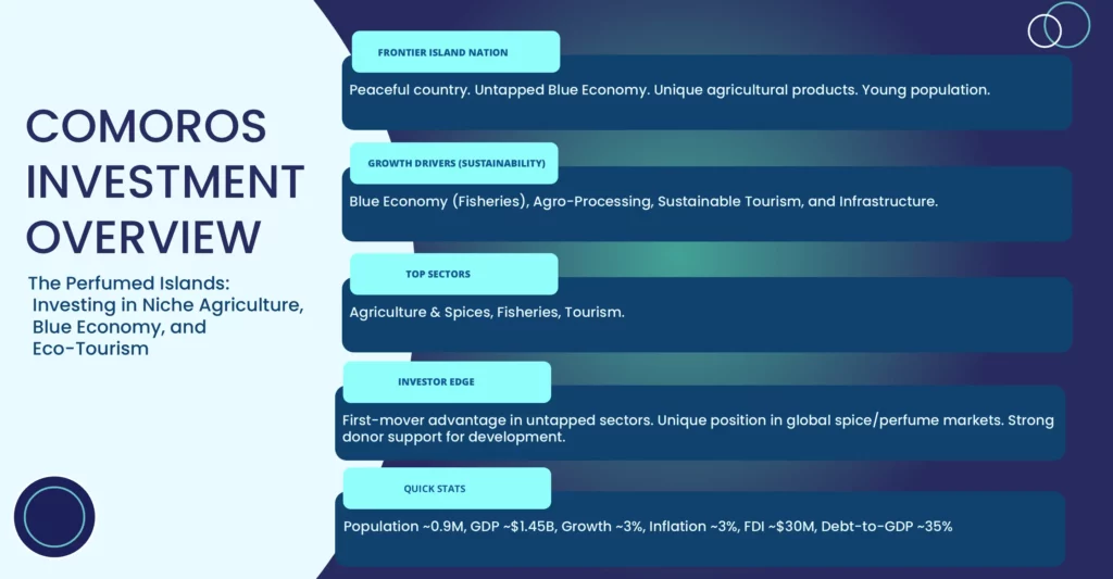 Les Comores offrent une opportunité d'investissement en frontier pour les investisseurs, axée sur le développement durable et les marchés de niche. Le paysage des investissements est axé sur la libération du potentiel immense de la « Blue Economy » (pêche, aquaculture, services marins) et de la « Green Economy » (amélioration des chaînes de valeur pour la vanille, le clou de girofle, l'ylang-ylang). Le gouvernement cherche activement à attirer des investissements étrangers pour aider à moderniser ces secteurs clés, développer l'industrie touristique naissante et améliorer les infrastructures. L'Agence Nationale pour la Promotion des Investissements (ANPI) est le point de contact pour faciliter les nouveaux investissements.