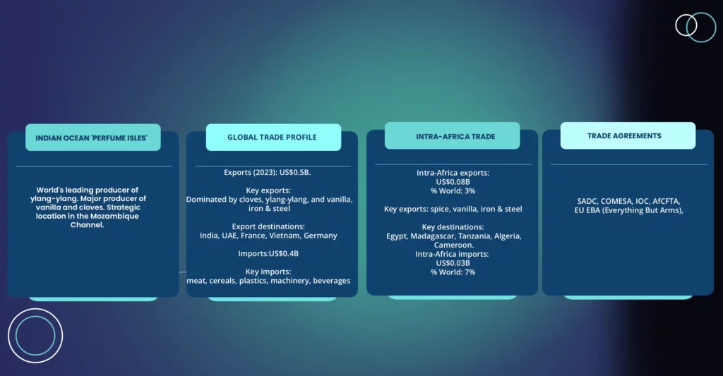 - AfCFTA (Zone de libre-échange continentale africaine) : Les Comores ont ratifié l'accord, ouvrant l'accès au vaste marché africain pour leurs produits uniques et leur secteur des services émergents.
