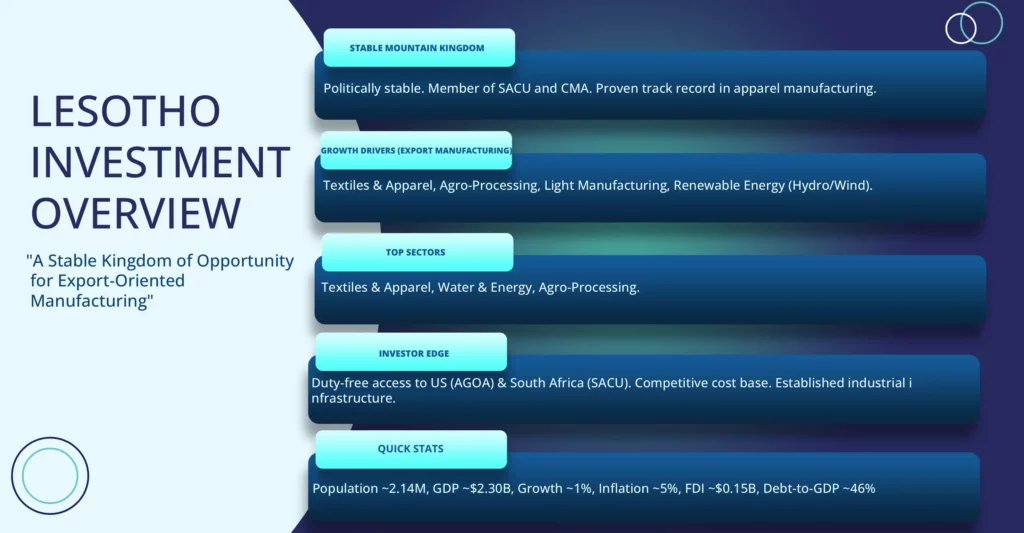 Le Lesotho se positionne comme une destination d'investissement émergente en Afrique australe, tirant parti de sa profonde intégration commerciale, de sa stabilité politique et de son économie axée sur l'exportation. Avec une solide base dans la fabrication de textiles et de vêtements, une dynamique croissante dans l'exploitation de diamants de grande valeur, et des initiatives dirigées par le gouvernement pour diversifier dans l'agro-industrie et la fabrication légère, le Lesotho présente des opportunités attractives pour les investisseurs. Sa localisation stratégique au sein de l'Union douanière d'Afrique australe (SACU), son accès préférentiel au marché grâce à l'AGOA et à l'APE UE, son environnement favorable aux investisseurs et son engagement en faveur du développement industriel en font une destination attrayante pour les entreprises internationales souhaitant accéder aux chaînes de valeur régionales et mondiales.