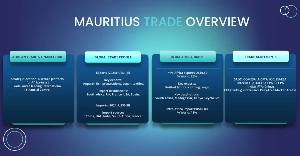 - Réexportations / Transbordement : En expansion rapide via le Mauritius Freeport, un centre régional de logistique et de valeur ajoutée.