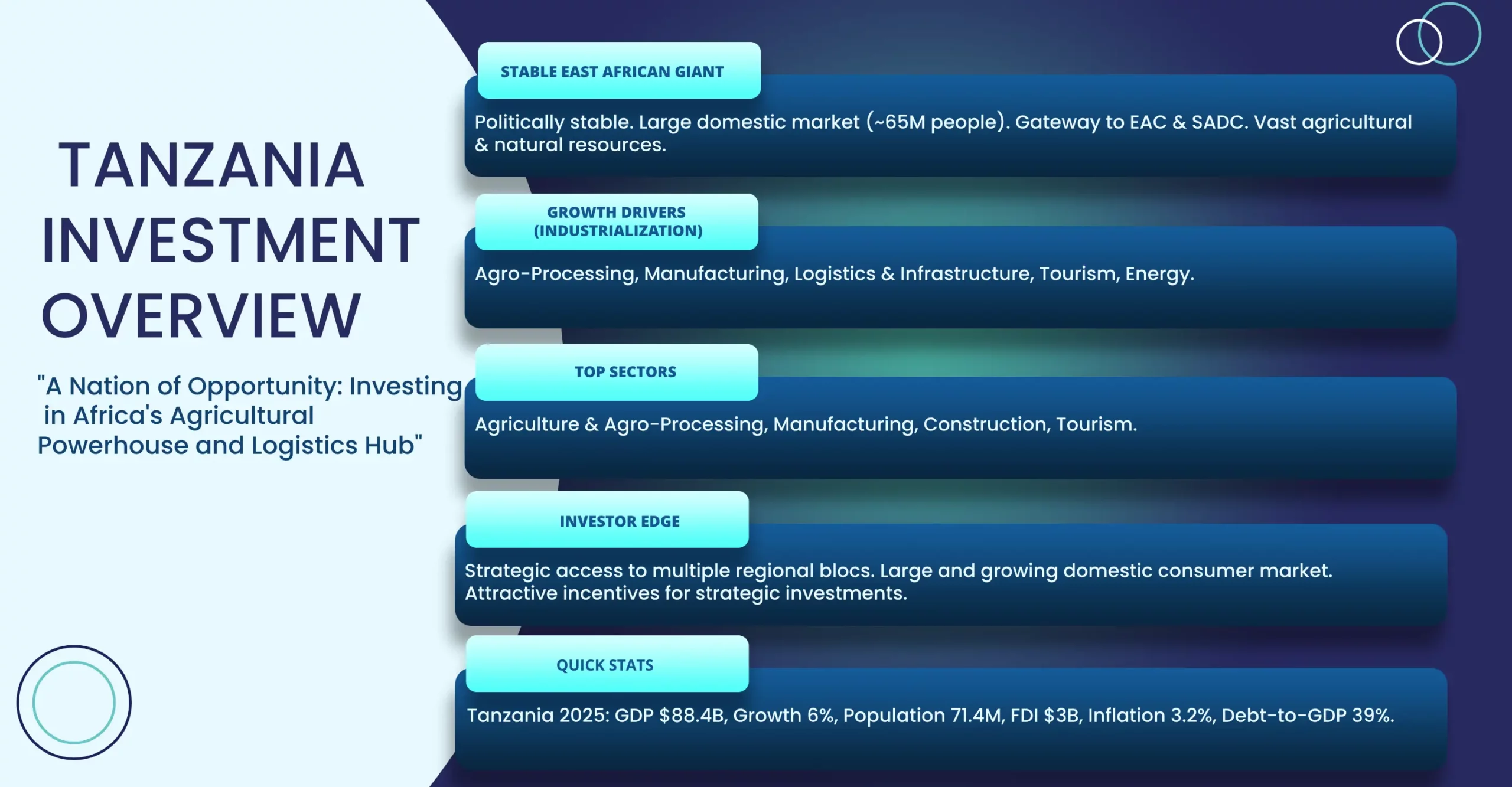 La Tanzanie émerge rapidement comme une puissance commerciale et d'investissement en Afrique de l'Est et centrale. Sa situation stratégique, ses ressources naturelles abondantes et son engagement en faveur de l'industrialisation en font une destination attrayante pour les investisseurs mondiaux. Avec des investissements croissants dans la logistique, l’énergie, l’agro-industrie, l’exploitation minière et l’économie bleue, la Tanzanie offre des opportunités lucratives soutenues par une infrastructure moderne, des politiques centrées sur l’investisseur et une main-d’œuvre jeune et dynamique.