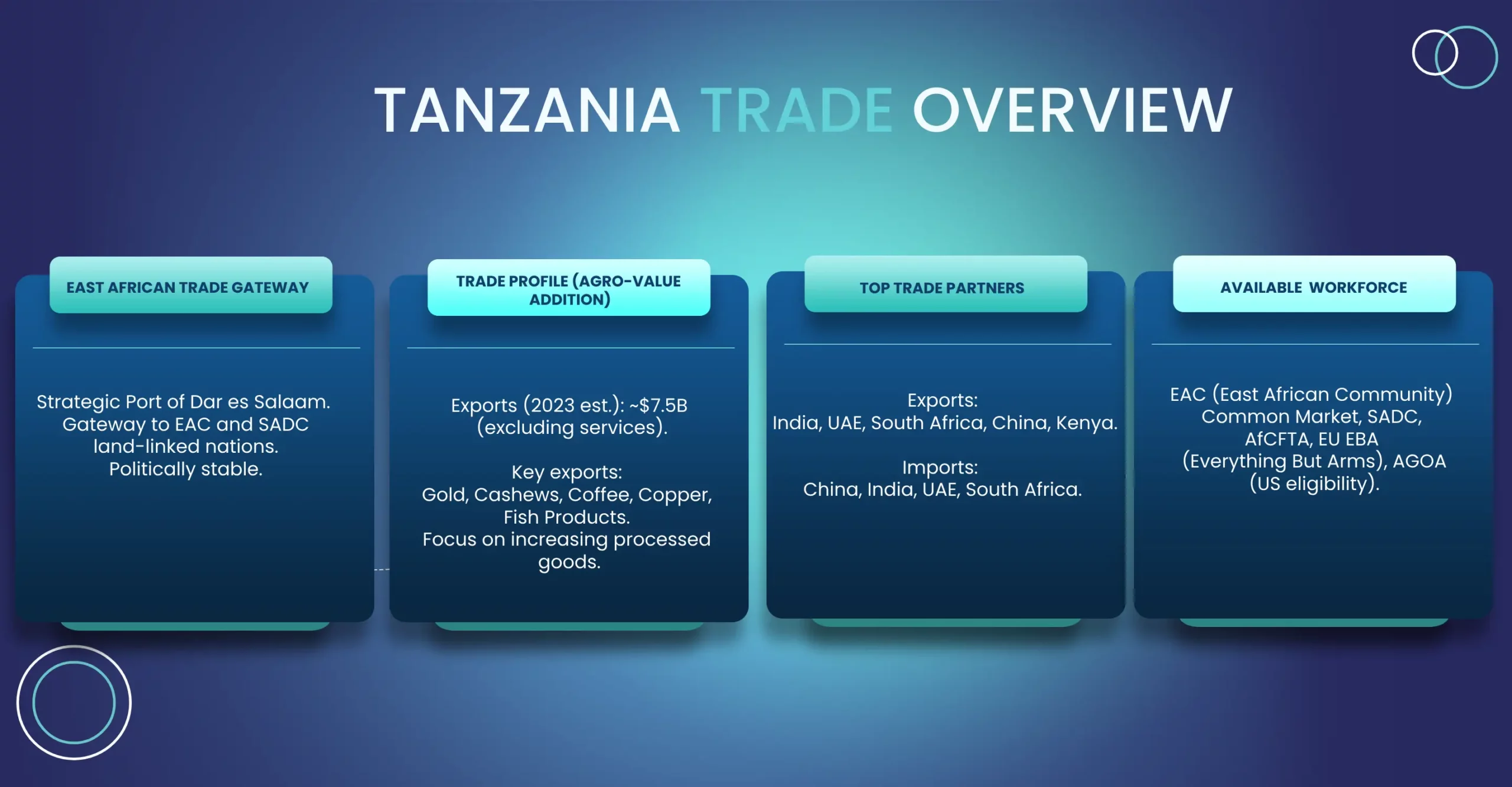 Exploiter l'appartenance de la Tanzanie à l'EAC, à la SADC et à l'AfCFTA pour établir une base manufacturière afin de desservir plus d'un milliard de personnes avec des tarifs préférentiels.